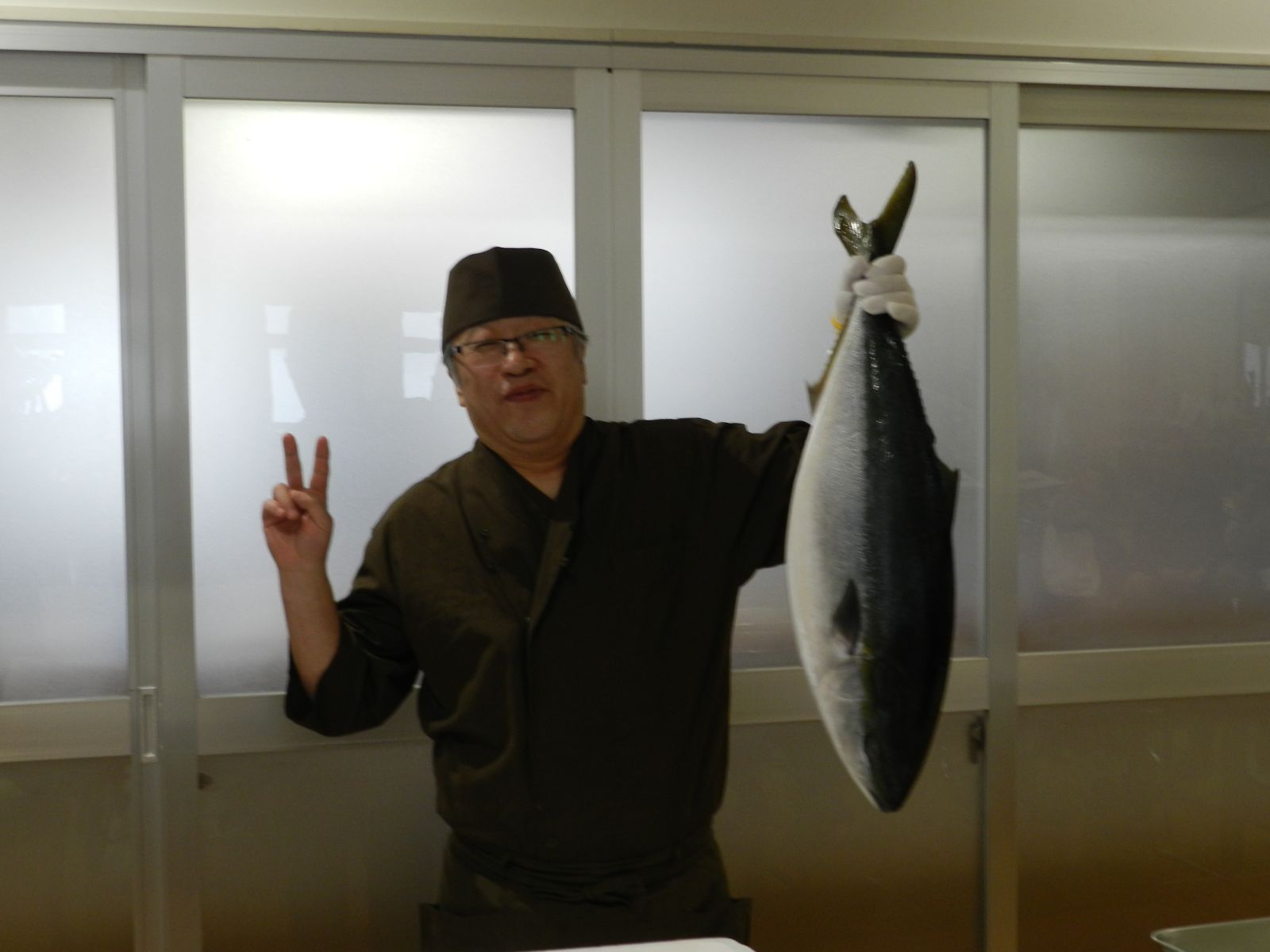 恒例の「鰤の解体ショー」が行われました。できれば、「鮪の解体ショー」といきたいところなのですが、予算の関係で「鰤」に活躍頂いています。