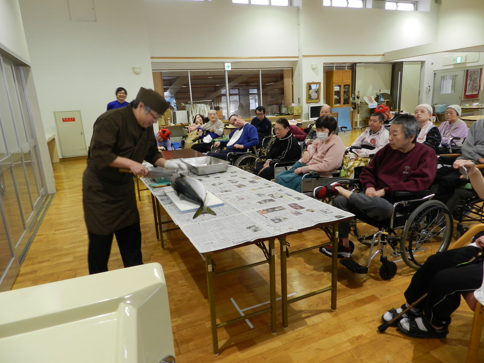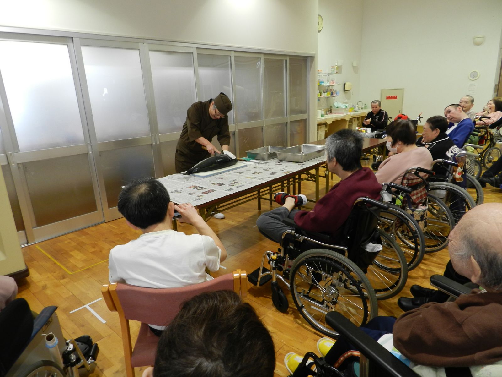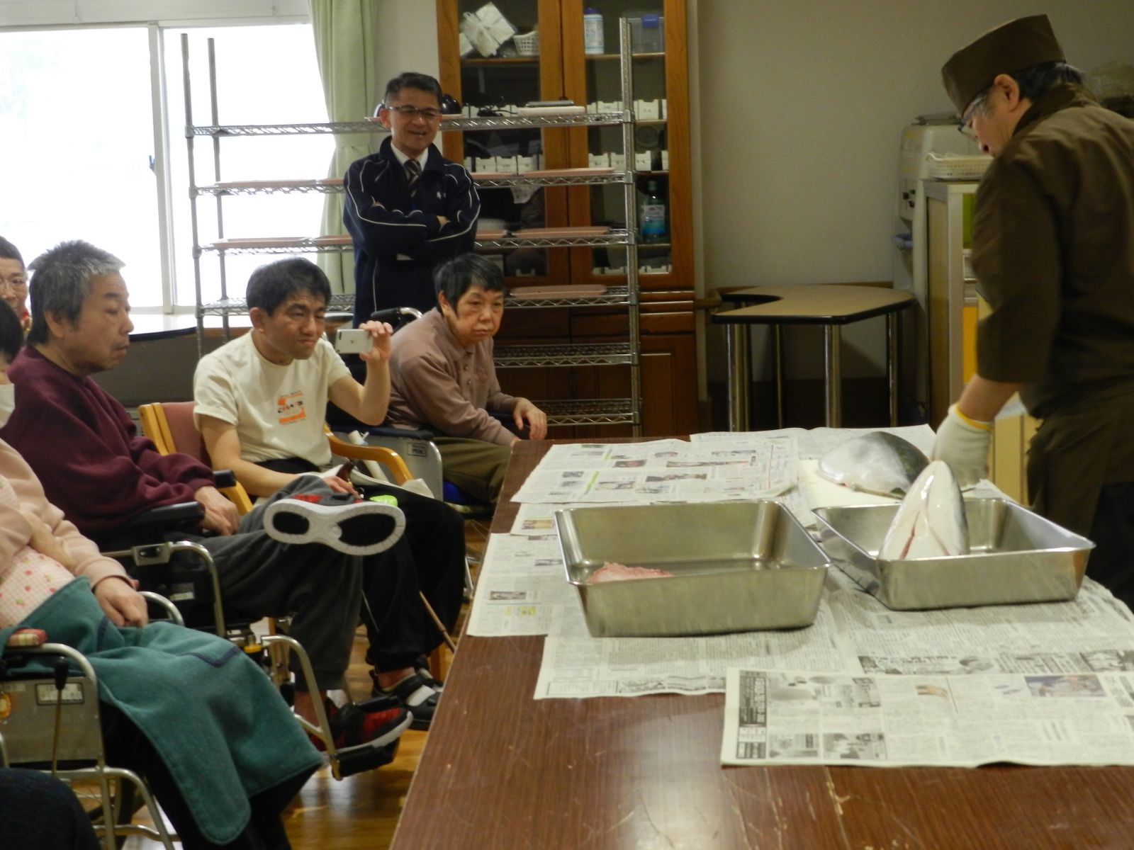 日清医療食品のインストラクター 内田さんの見事な包丁さばきに、見学していた利用者さんからは、大きな歓声があがっていました。中には、手を挙げて内田さんに質問される方もあり、終始和やかな雰囲気で行われました。重さ9キロ、脂が載った立派な鰤は、この後、利用者さんの旺盛な食欲を満足させてくださいました。