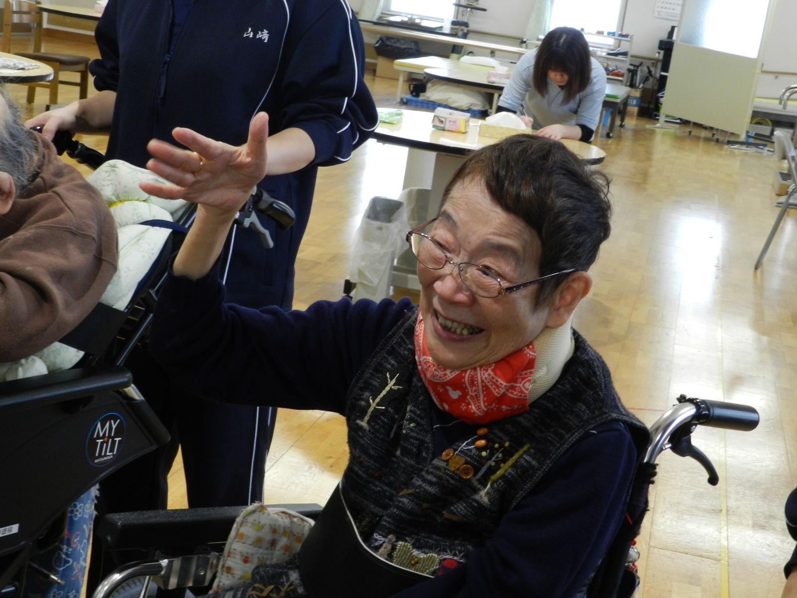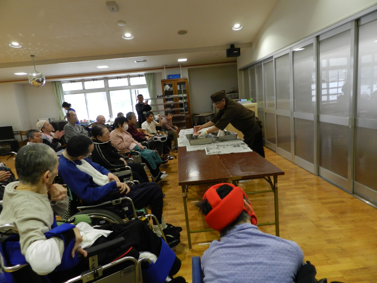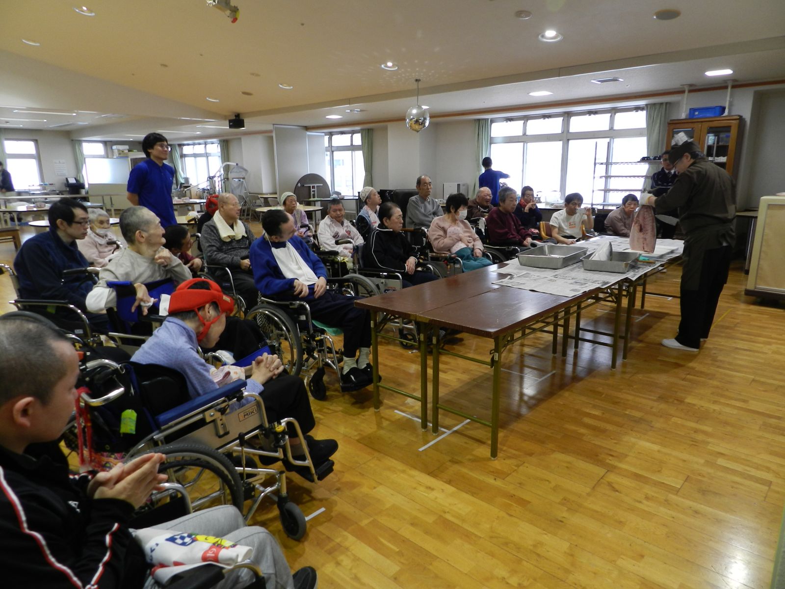 日清医療食品のインストラクター 内田さんの見事な包丁さばきに、見学していた利用者さんからは、大きな歓声があがっていました。中には、手を挙げて内田さんに質問される方もあり、終始和やかな雰囲気で行われました。重さ9キロ、脂が載った立派な鰤は、この後、利用者さんの旺盛な食欲を満足させてくださいました。