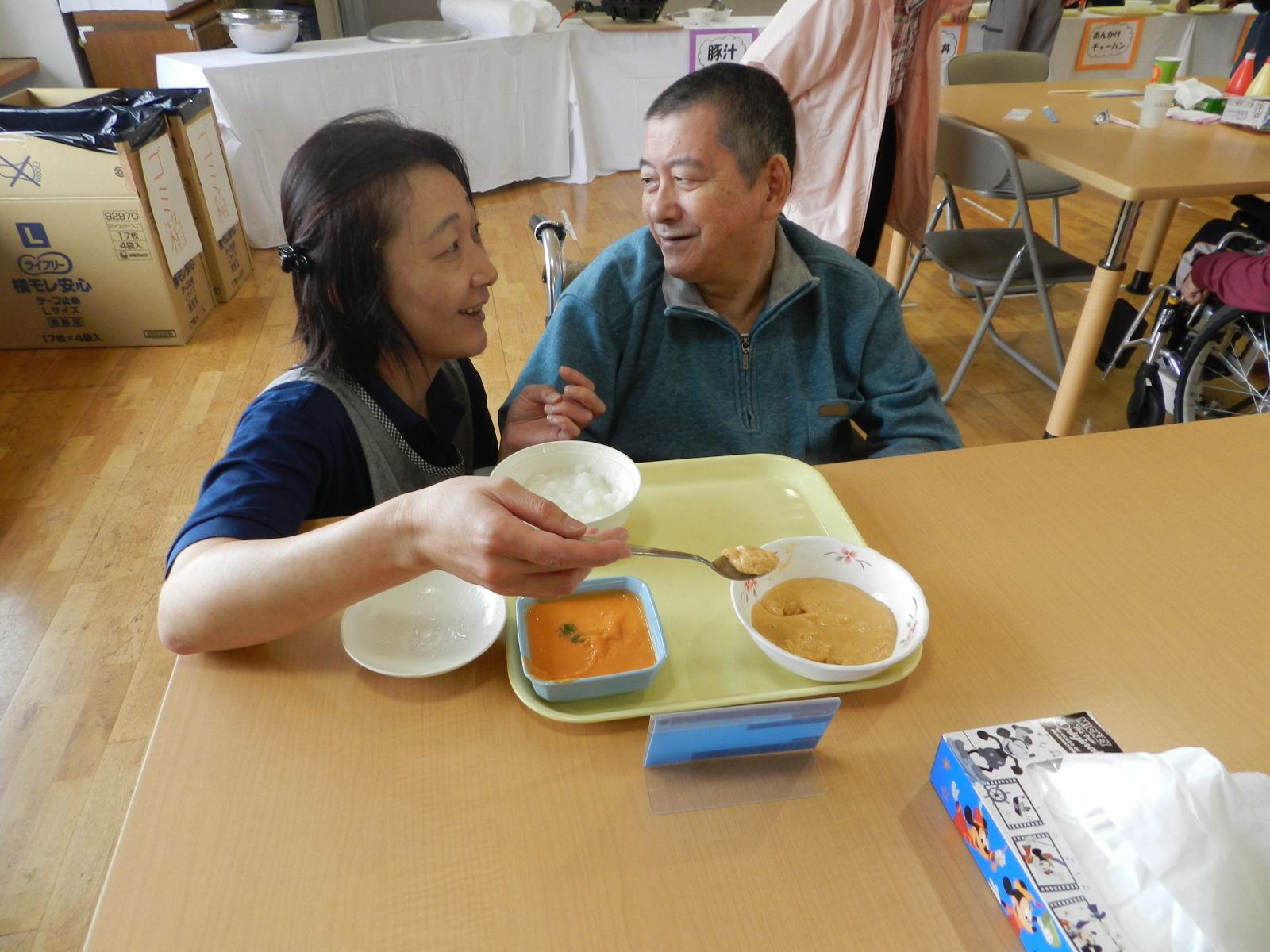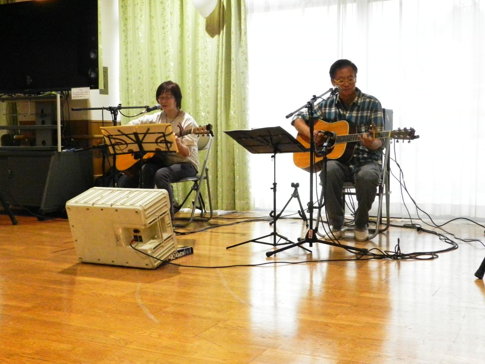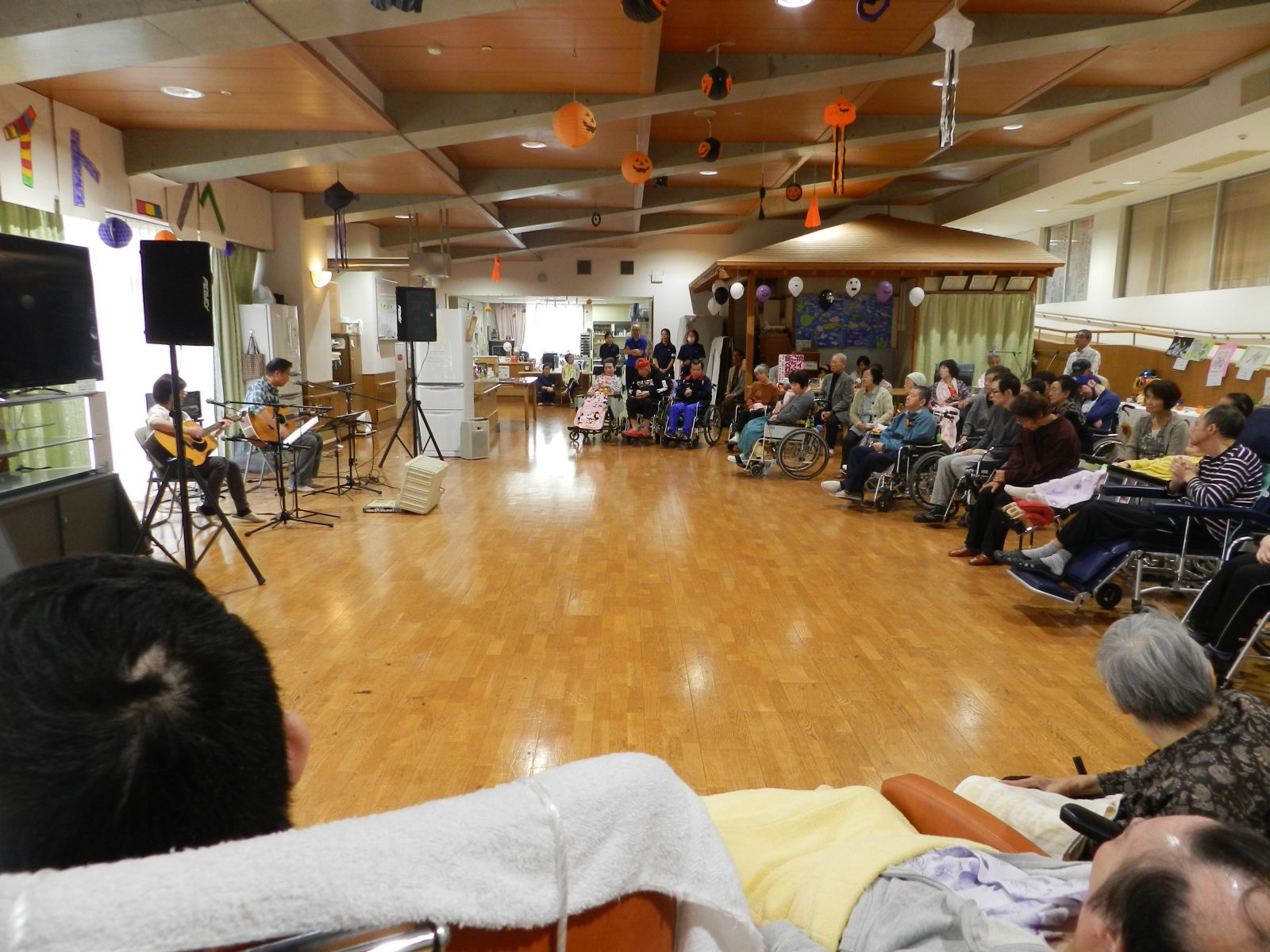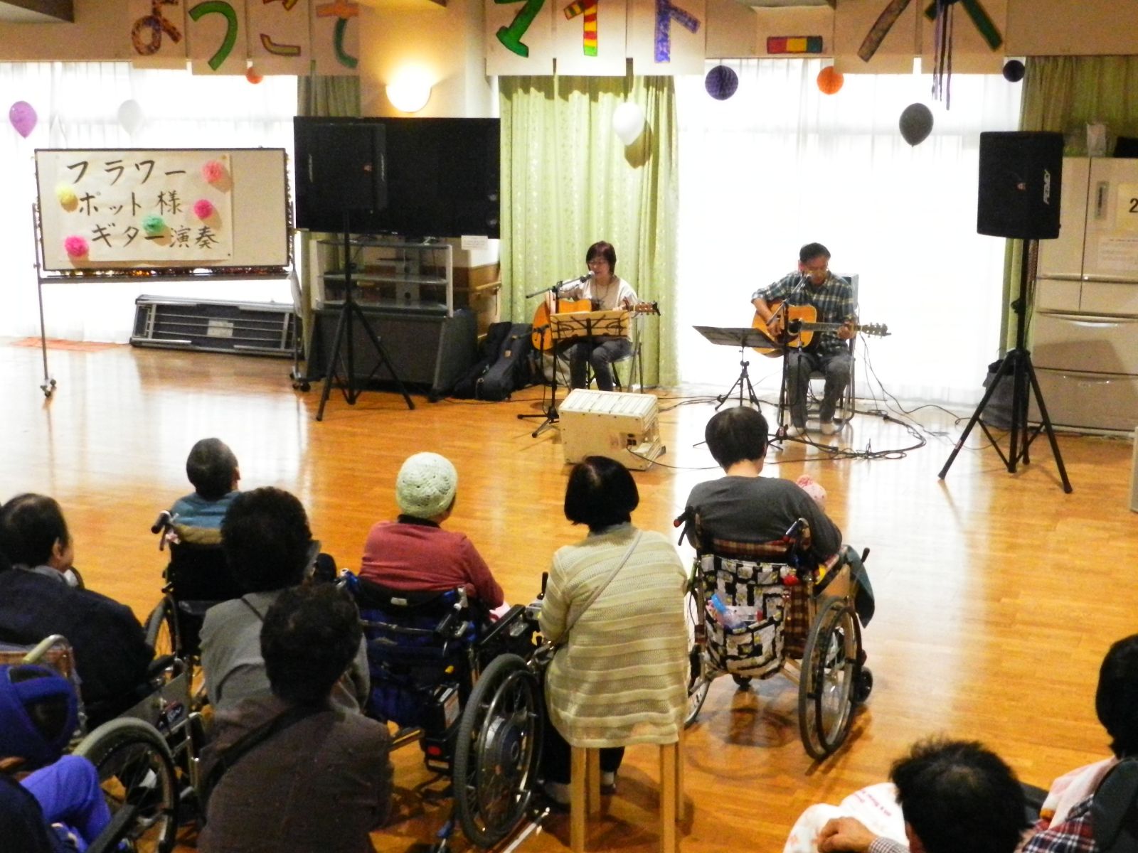 アトラクションの会場は、1階の生活介護スペースと中2階の集い広場を使用し、色々と楽しい催し物が行われました。2階では、食堂兼喫茶店を運営しました。アトラクションのメインは「フラワーポット」様によります歌とギター演奏を楽しんで頂きました。観覧されたお客様は、とっても美しいハーモニーと歌声、ギター演奏に大きな拍手と歓声を送っておられました。皆様、さぞかし堪能されたことと思います。今回は、皆さんの作品が展示された様子と会場での楽しそうな雰囲気が伝わる写真を掲載してみましたので、ご覧頂けると嬉しいです。